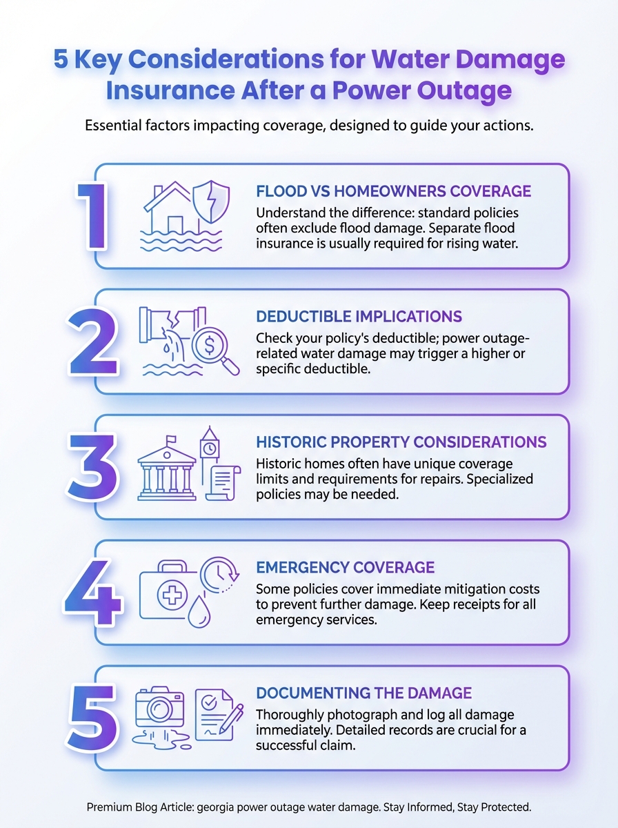 Five key considerations for water damage insurance after a power outage are summarized here. Use these insights to understand coverage and strengthen your claim in Georgia.