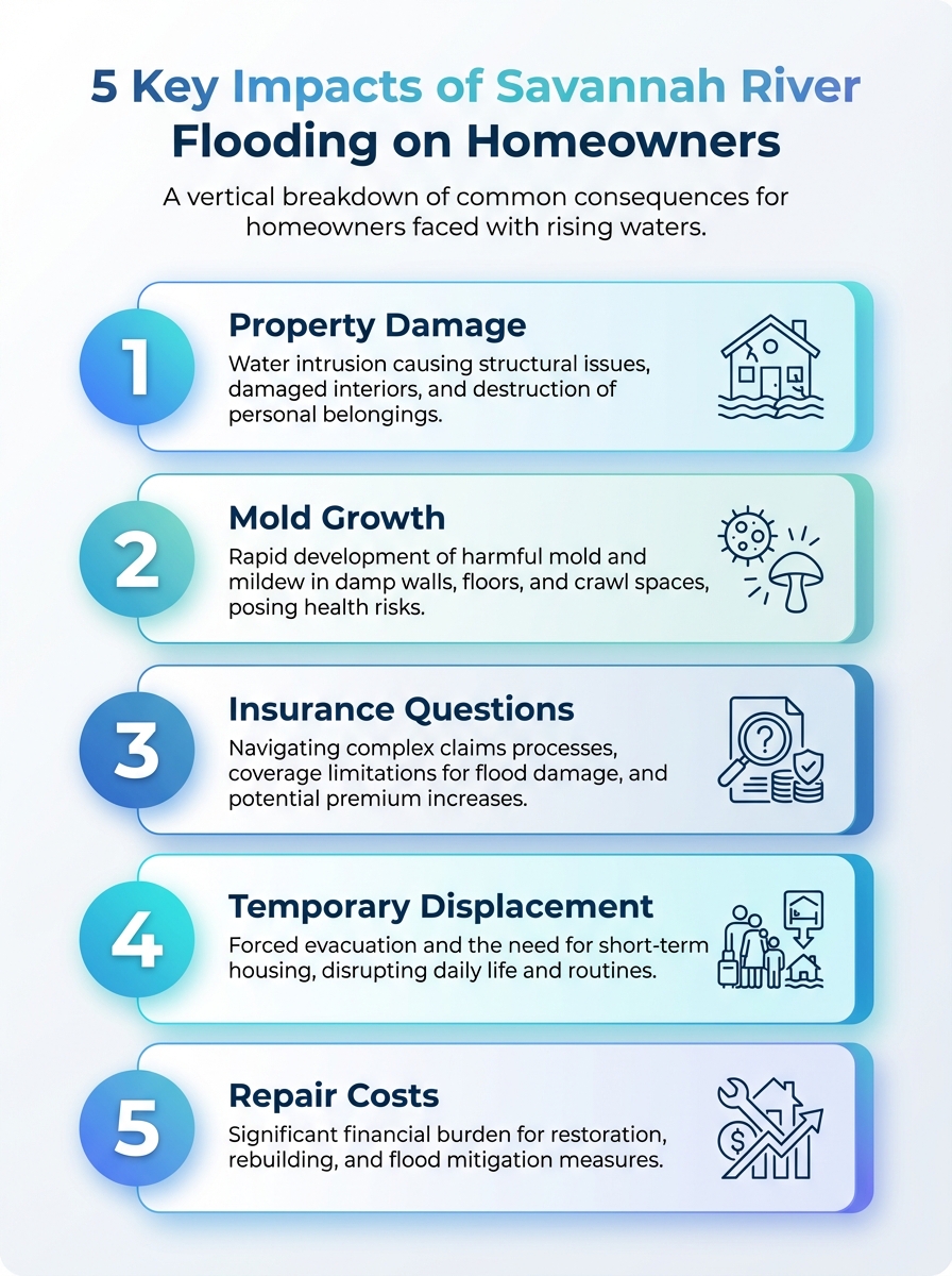 An infographic illustrating the five key impacts of Savannah River flooding on homeowners. It covers property damage, insurance considerations, repair costs, evacuation, and flood risk.